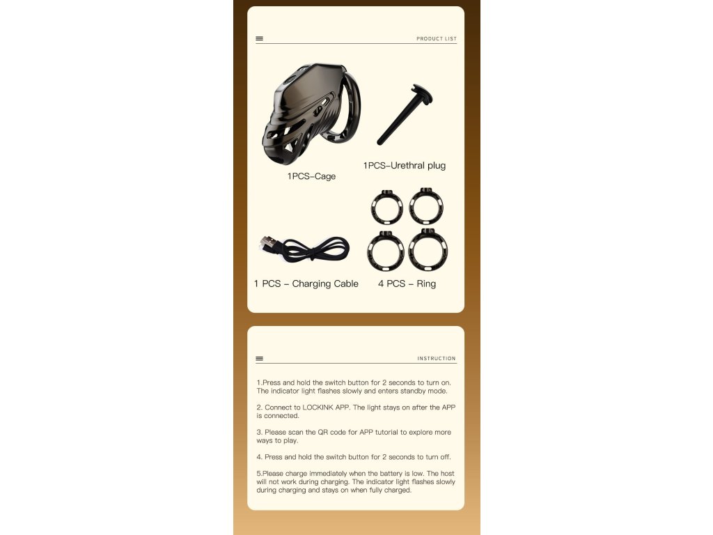 Vyroben z kvalitního ABS plastu, který je pevný, hladký a zdravotně nezávadný. Po každém použití doporučujeme očistit jemným mýdlem a dezinfekčním prostředkem určeným pro erotické pomůcky. Nabíjej pouze po úplném vyschnutí klece.