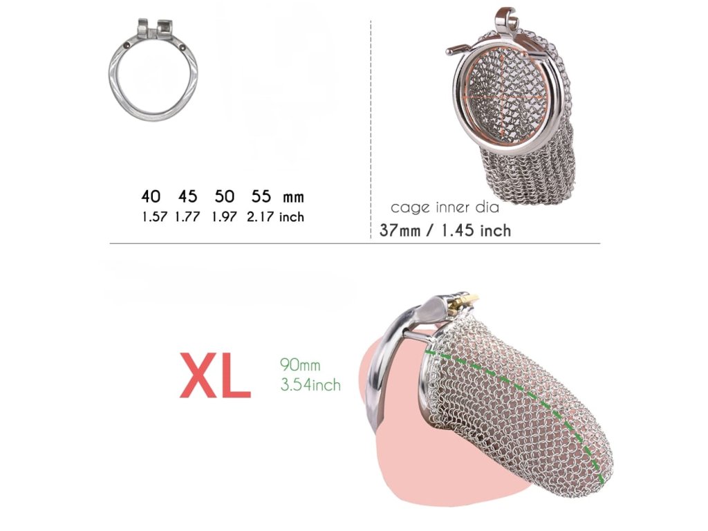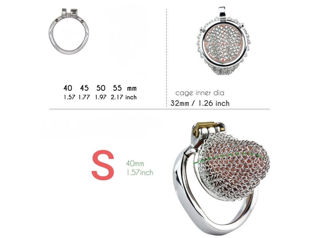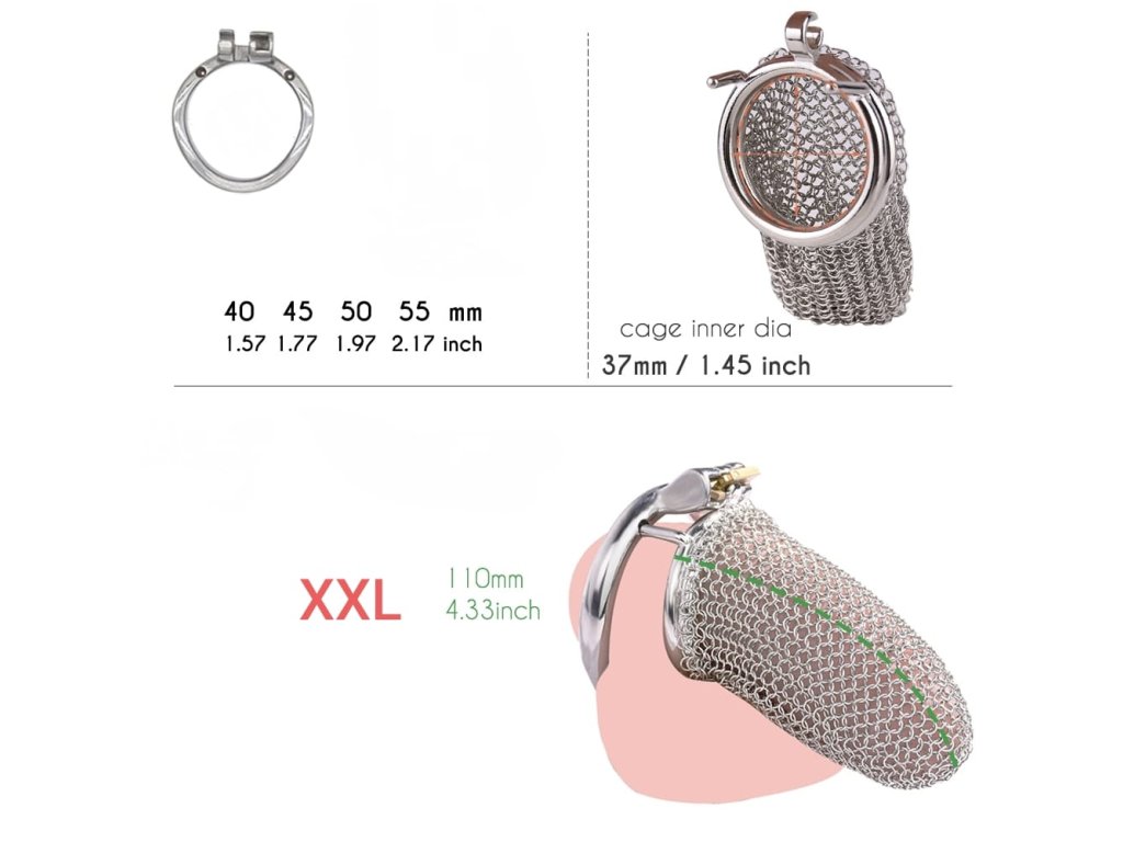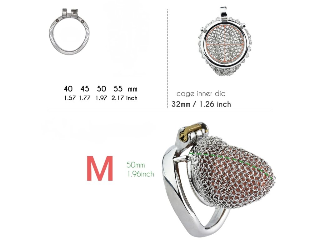 Nošení: Vyberte si velikost při objednávce podle délky penisu v klidném stavu. Anatomicky tvarovaný kroužek se přizpůsobí tvaru těla lépe než kruhový. Pokud si nejste jisti velikostí, doporučujeme začít s větší velikostí. Kovová konstrukce vyžaduje více lubrikace než plastové alternativy. Mesh design je flexibilnější a pohodlnější než pevné klece. Dokonalé větrání umožňuje dlouhodobé nošení s minimálními hygienickými komplikacemi. Vhodné pro krátkodobé i dlouhodobé nošení (při správné hygieně).