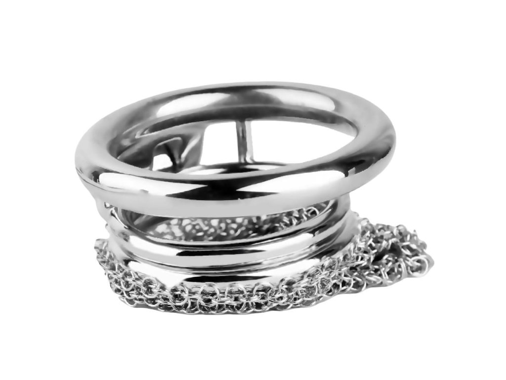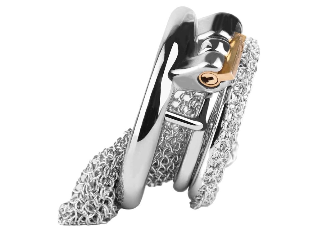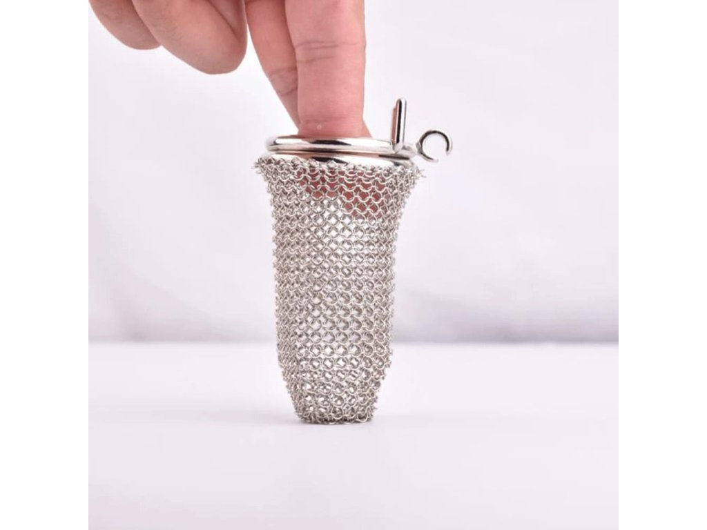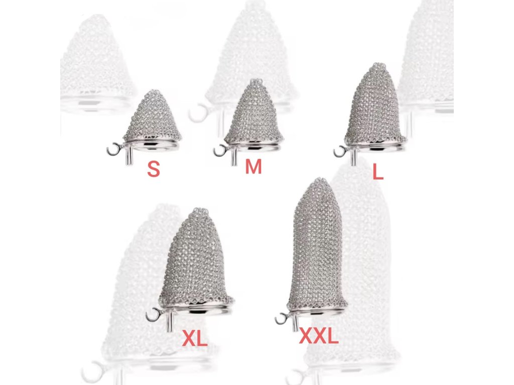 Obsah balení: 1× kovová klec Chain Mesh, 1× anatomicky tvarovaný kroužek dle zvolené velikosti, 1× kovový bezpečnostní zámek s mosazným válečkem, 2× klíče