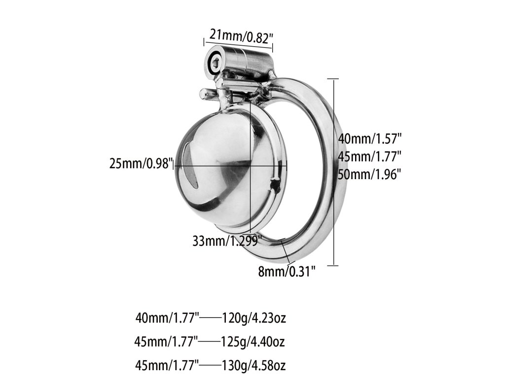 Údržba: Omyjte teplou vodou s antibakteriálním mýdlem. Hladký kupolový povrch se čistí snadno – stačí jemný hadřík nebo vatový tampón. Před nasazením vždy důkladně osušte. Kovový zámek občas promazte kapkou oleje pro snadné otevírání. Klíče uchovávejte na bezpečném místě – ideálně u dominantního partnera.